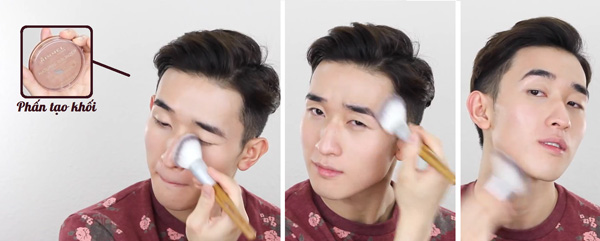 Một vẻ đẹp nam tính không thể thiếu đi những đường nét góc cạnh, mạnh mẽ trên khuôn mặt. Việc dùng kem và phấn ở trên dường như đã làm khuôn mặt của bạn trở nên có phần trắng tái và hơi nữ tính. Giờ bạn chỉ cần dùng phấn tạo khối và cọ dày vát chéo để tán lên những vùng được cho là góc cạnh của nam giới, đó là: hai bên sống mũi, dưới xương gò má, dọc mai tóc và vùng xương quai hàm. Việc tán phấn tạo khối này sẽ giúp trả lại vẻ đẹp 3D góc cạnh cho khuôn mặt của bạn.