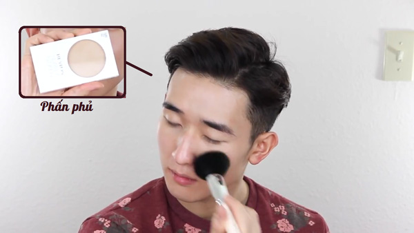 Làn da của nam giới thường khá nhiều dầu, khiến khuôn mặt bóng nhẫy kém thu hút. Bạn hãy sử dụng phấn phủ và phủ một lớp phấn mỏng đều toàn bộ khuôn mặt để hạn chế dầu. Nguyên tắc trang điểm bao giờ cũng là "ít mà hiệu quả". Vì vậy chỉ cần một lớp mỏng là vừa đủ dùng rồi. Bạn đừng ham đánh phấn quá nhiều sẽ khiến lớp da bị "dày bột" rất kém tự nhiên.